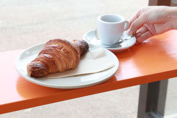 店舗に入るとコーヒーの良い香りに包まれ、店内では正面に広がる田園風景を眺めながら、本場イタリアのエスプレッソや自家焙煎のスペシャルティコーヒー、曜日限定のクロワッサンやスコーンをはじめとする自家製焼き菓子が楽しめます。