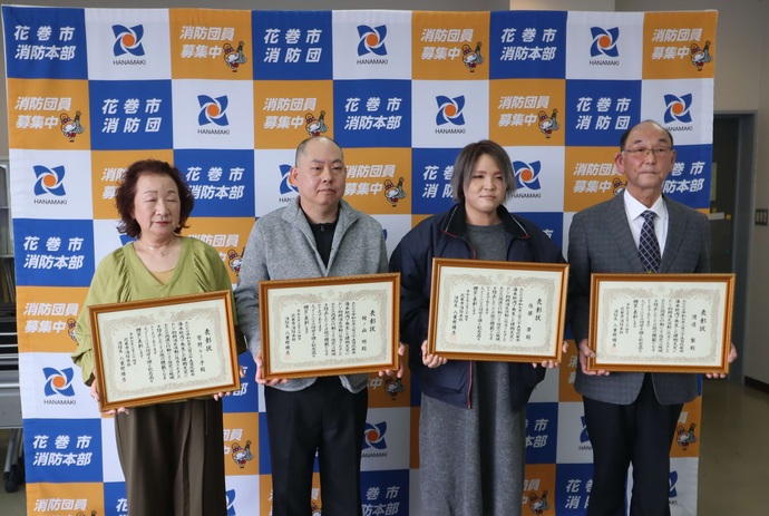 この表彰は、令和7年2月25日(木曜)花巻市内で発生した建物火災において、火災に気づき現場に駆け付けた4人が家人と協力してバケツリレーによる初期消火を実施。周囲の住宅への延焼を防ぎ、被害を最小限に抑えた功労に対するものです。