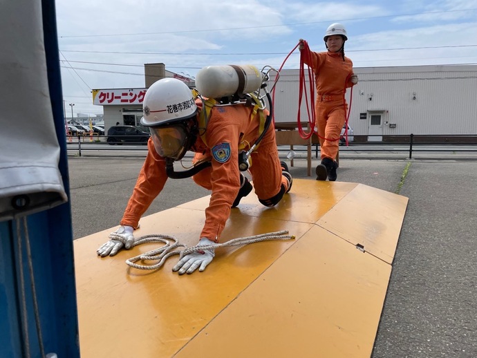 ビルや地下街などで煙に巻かれた人を救出するための訓練です